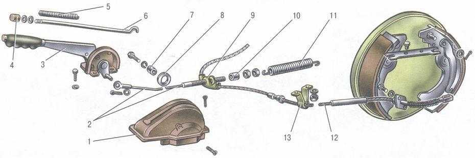 1 – тормозной механизм заднего колеса; 2 – рычаг привода регулятора давления; 3 – задний трос стояночного тормоза; 4 – регулятор давления; 5 – направляющая заднего троса; 6 – передний трос стояночного тормоза; 7 – рычаг стояночного тормоза; 8 – педаль тормоза; 9 – вакуумный усилитель; 10 – тормозной механизм переднего колеса; 11 – трубопровод контура передних и задних тормозов; 12 – трубопровод контура передних тормозов; 13 – главный цилиндр; 14 – бачок главного цилиндра.