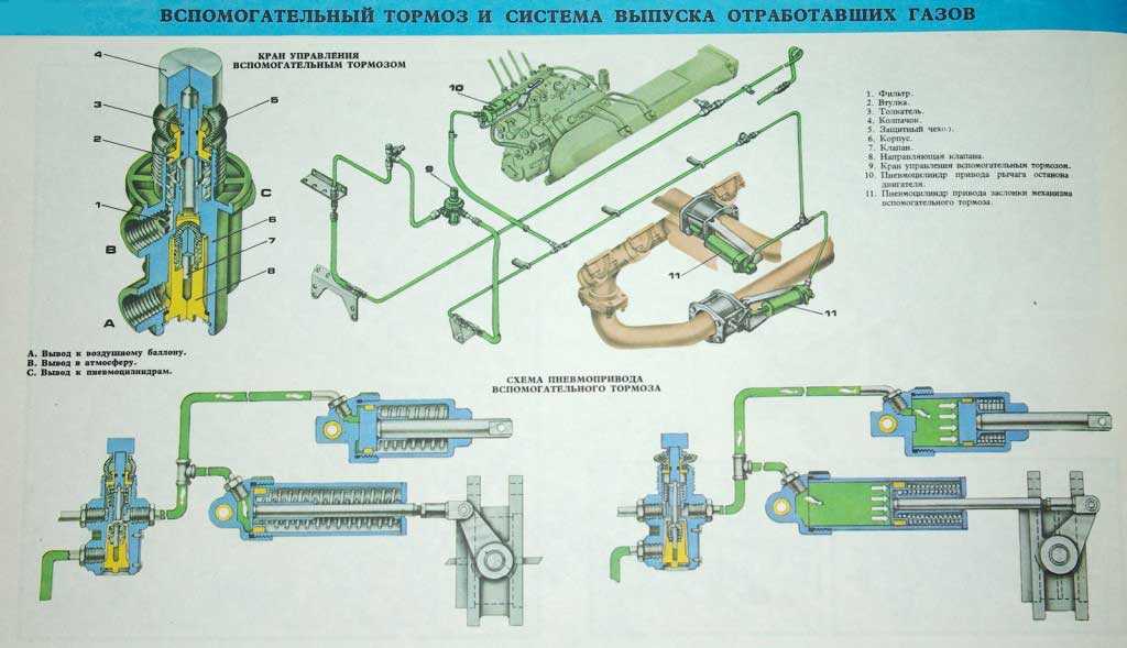 Педаль связана с клапаном, который расположен между контуром системы и ресивером. При нажатии на нее клапан открывается и воздух под давлением поступает на главный, а затем на колесные цилиндры, которые приводят в движение колодки.
