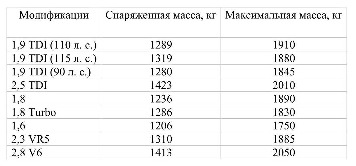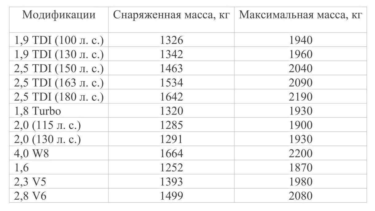 Таблица 4. Масса «Фольксваген Пассат B5» (выпуск 2000-2005 года).