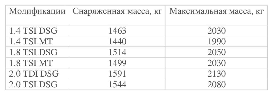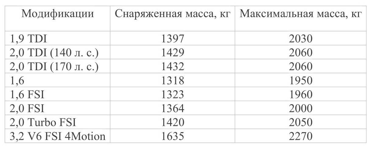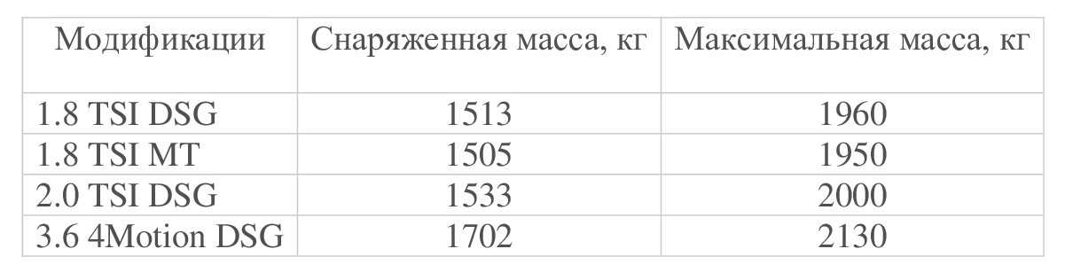 Вес каждой из моделей «Фольксваген Пассат» указан в таблицах, приведенных ниже.