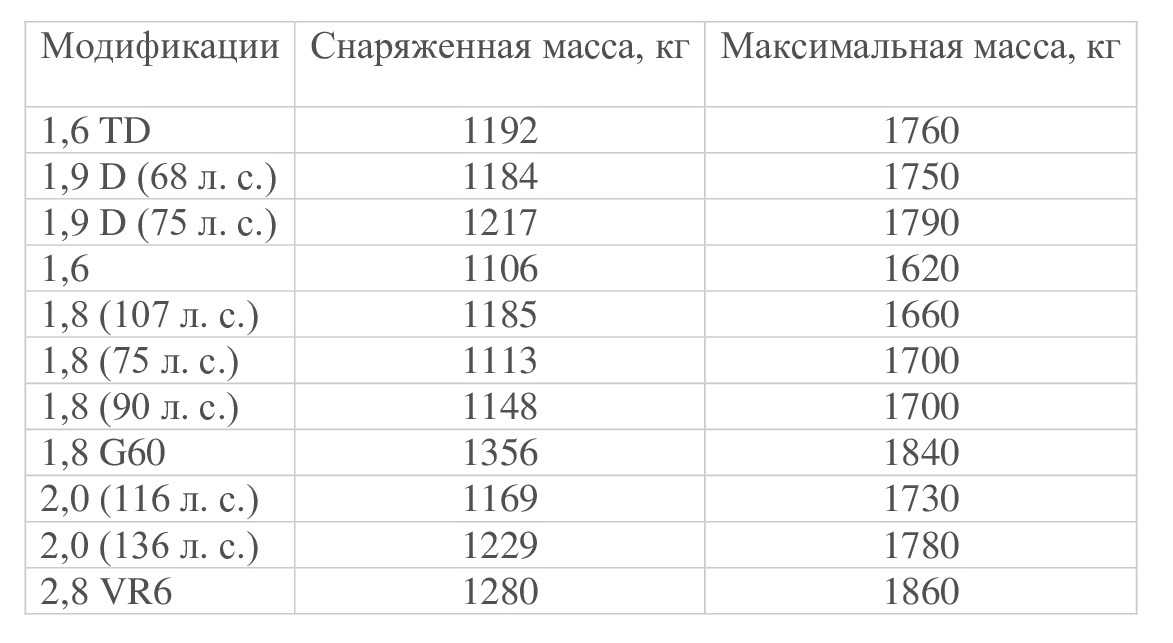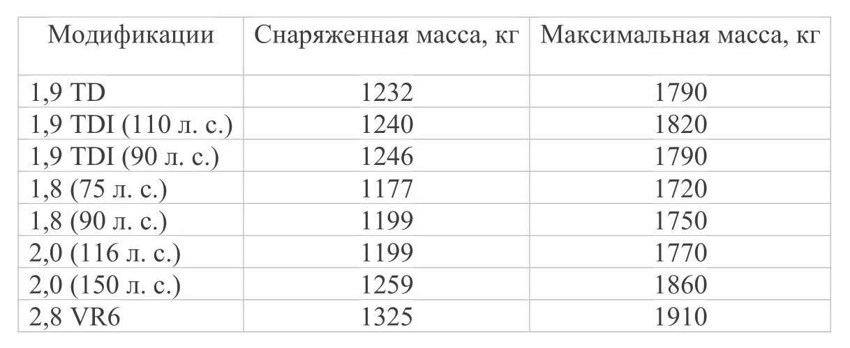Таблица 3. Масса «Фольксваген Пассат B5» (выпуск до 2000 года).