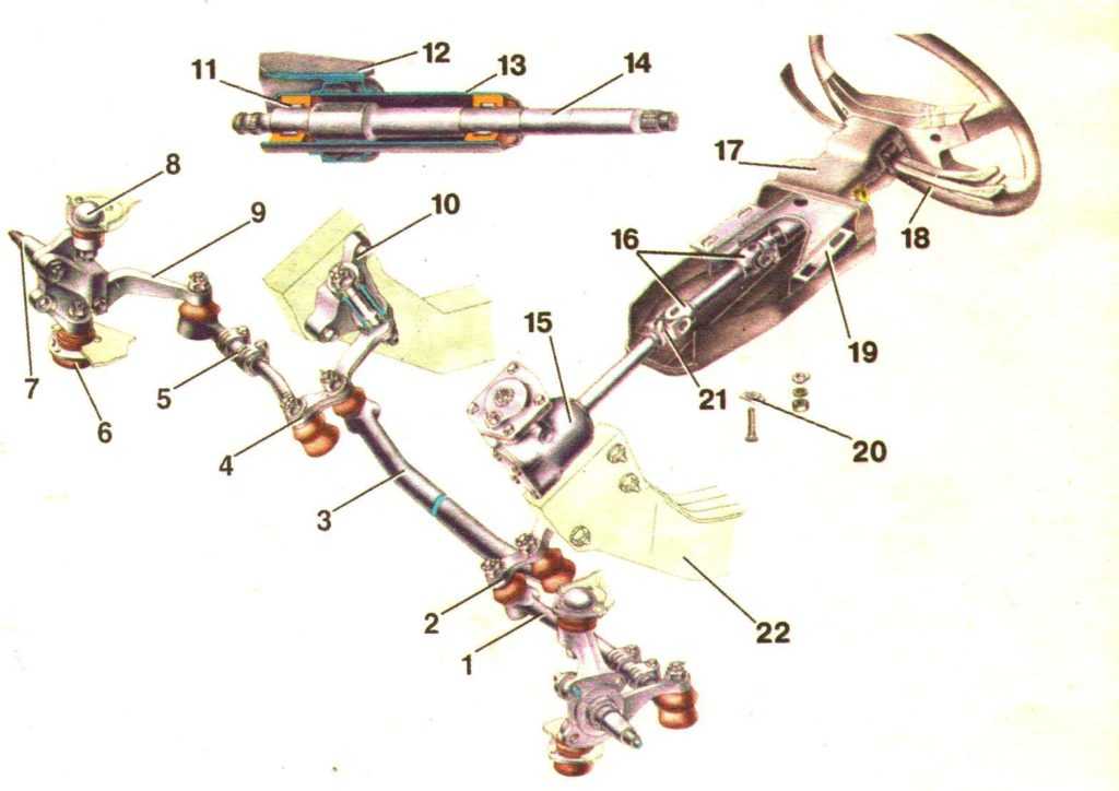 1– боковая тяга. 2– сошка. 3– средняя тяга. 4 – Маятниковый рычаг. 5– регулировочная муфта. 6- нижний шаровой шарнир передней подвески. 7- правый поворотный кулак. 8- верхний шаровой шарнир передней подвески. 9- правый рычаг поворотного кулака. 10- кронштейн маятникового рычага. 11- подшипник верхнего вала рулевого управления. 12, 19- кронштейн крепления вала рулевого управления. 13- труба кронштейна крепления вала рулевого управления. 14- Верхний вал рулевого управления. 15- картер рулевого механизма. 16- промежуточный вал. 17- облицовочный кожух. 18- рулевое колесо. 20- фиксирующая пластина передка кронштейна. Стяжной болт крепления карданного шарнира. 22- лонжерон кузова.